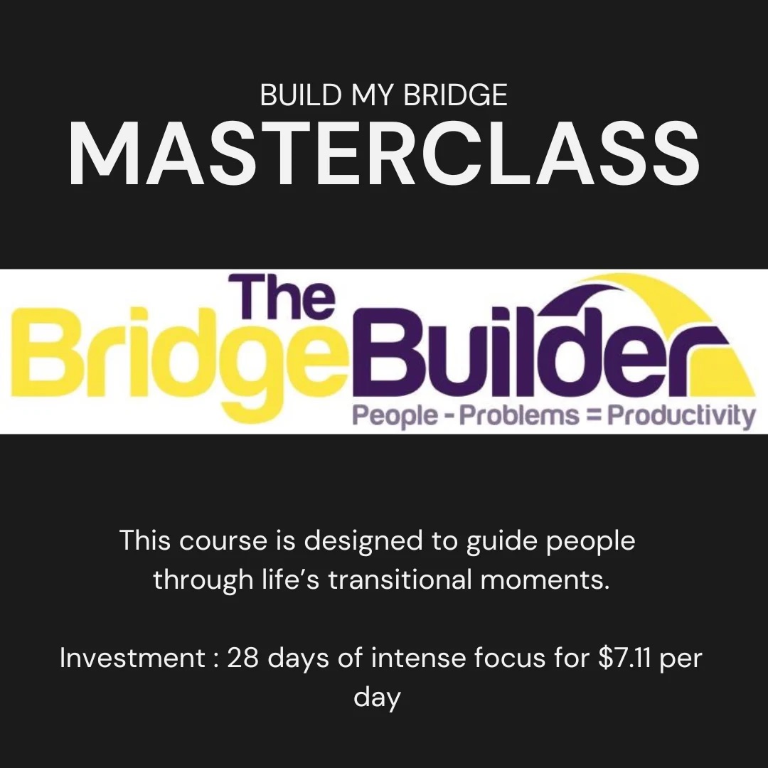 The Build My Bridge Masterclass is a 4-week program designed to guide people through life’s transitional moments with a 28-day manual workbook and 28 Virtual Videos of teaching and motivation to help you develop a clear plan on how to move forward.
